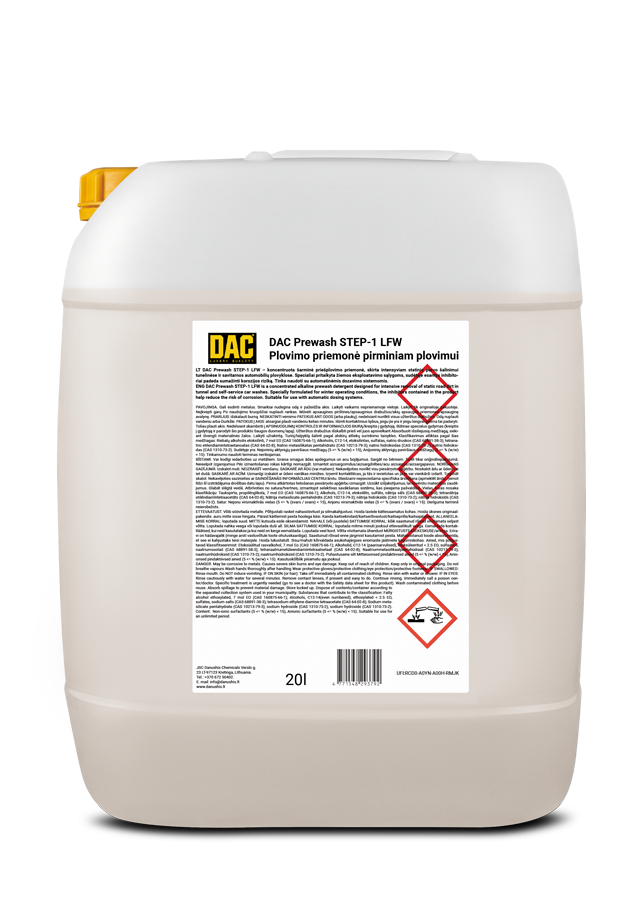 DAC Prewash STEP-1 LFW – koncentruota šarminė priešplovimo priemonė, skirta intensyviam statinio purvo šalinimui tunelinėse ir savitarnos automobilių plovyklose. Specialiai pritaikyta žiemos eksploatavimo sąlygoms, sudėtyje esantys inhibitoriai padeda sumažinti korozijos riziką. Tinka naudoti su automatinėmis dozavimo sistemomis.